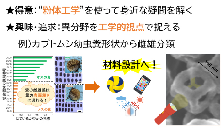 私は粉体を作り、その構造を調べて、機能材料に使うという三つの柱を中心に研究をしています。粉体の構造と機能の関係をすべて調べるには膨大な時間と労力がかかるので、機械学習を取り入れようと考えていたところでした。今回のカブトムシの例では、生体の糞という個体差の大きなサンプルが対象ですが、これらの個体差は排除して雄雌という分類に寄与する因子を“見える形”で抽出できる、というのが特徴です。この“見える形”というのが材料設計ではとても重要になってきます。今後この手法を粉体材料設計に生かしていき、将来的には社会に貢献できるような材料として発展させていきたいと思っています。